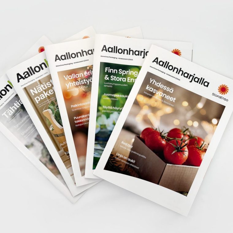 Sora Enso Packagingin Aallonharjalla-asiakaslehteä olemme toteuttaneet avaimet käteen -pakettina alusta alkaen, vuodesta 2011. Kaksi kertaa vuodessa ilmestyvän asiakaslehden ilme on uudistunut Stora Enso yritysilmeen päivittyessä, mutta jämäkkä sisällöntuotanto ja pakkausbisnekseen porautuminen pysyvät vuodesta toiseen.